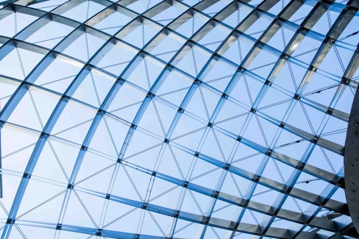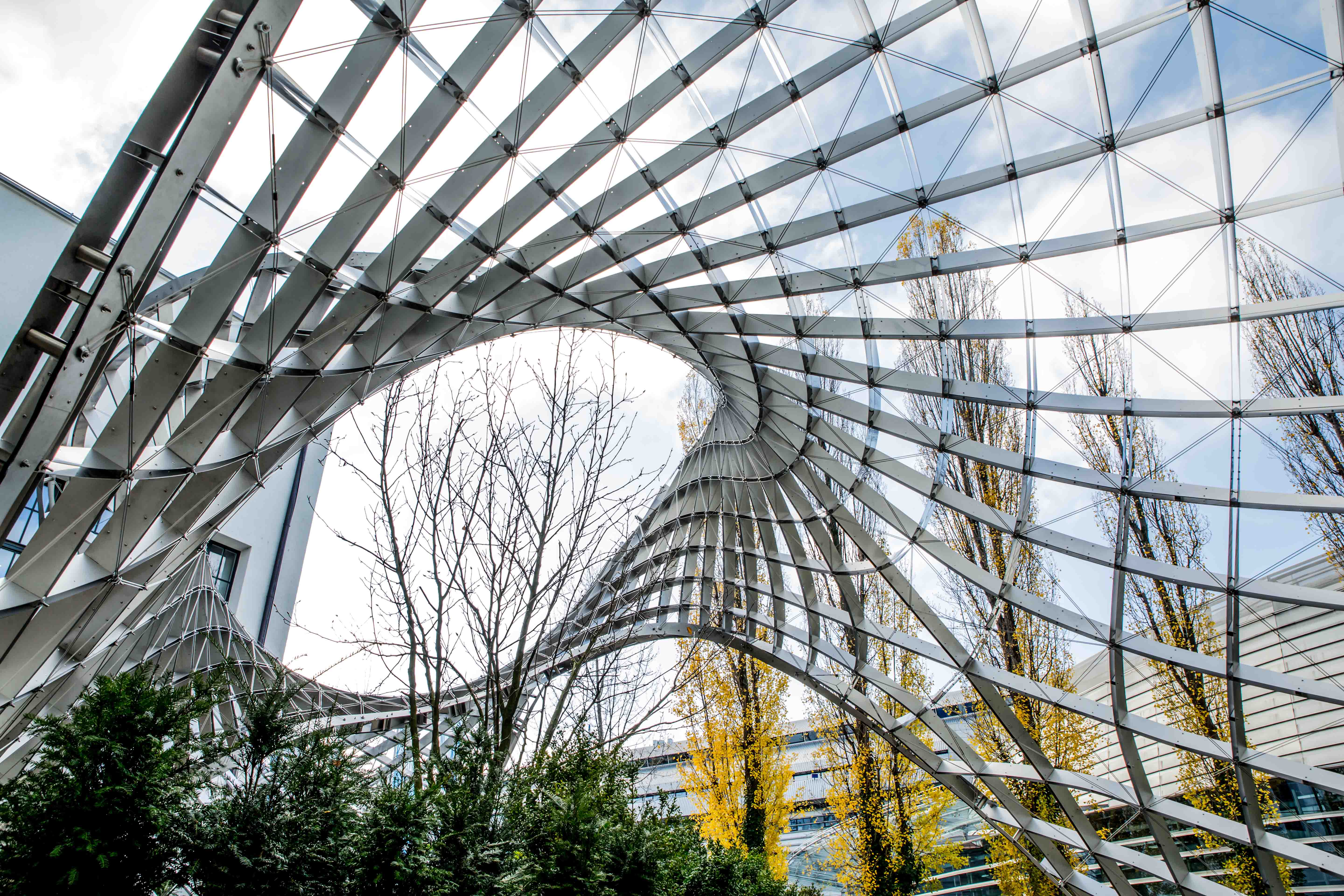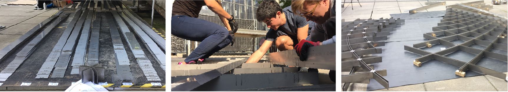 The grid structure is constructed from 1000 m of 1.5 mm thick and 100 mm wide stainless steel lamellas. It spans an area of approx. 90 m² and has a surface weight of only 18 kg/m², a total of 1,6 tons. INSIDE\OUT was built in September 2017 for the 150th aniversary of the TUM.