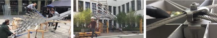The final form is fixed, by locking each joint to 90 degrees. The pavilion is assemble from 9 segments, which are bolted together on site. Finally, the grid is stiffened with diagonals cables.