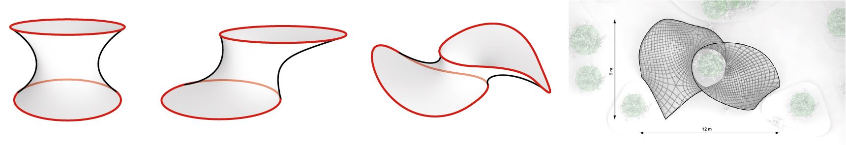 The design is based on a catenoid – the minimal surface between two circles. By adjusting the position and shape of these two boundary curves, an architectural space was designed, that adjusts to the green islands of this courtyard.