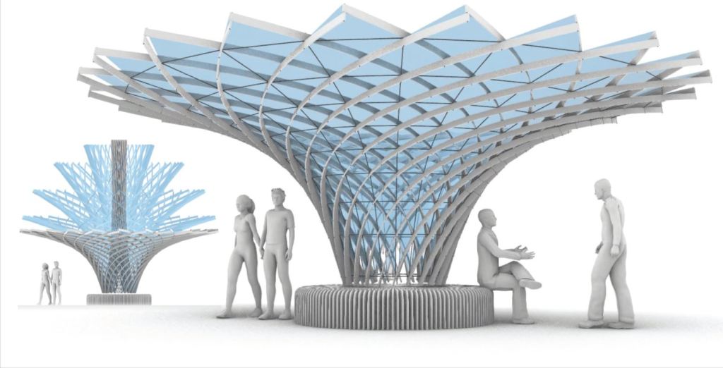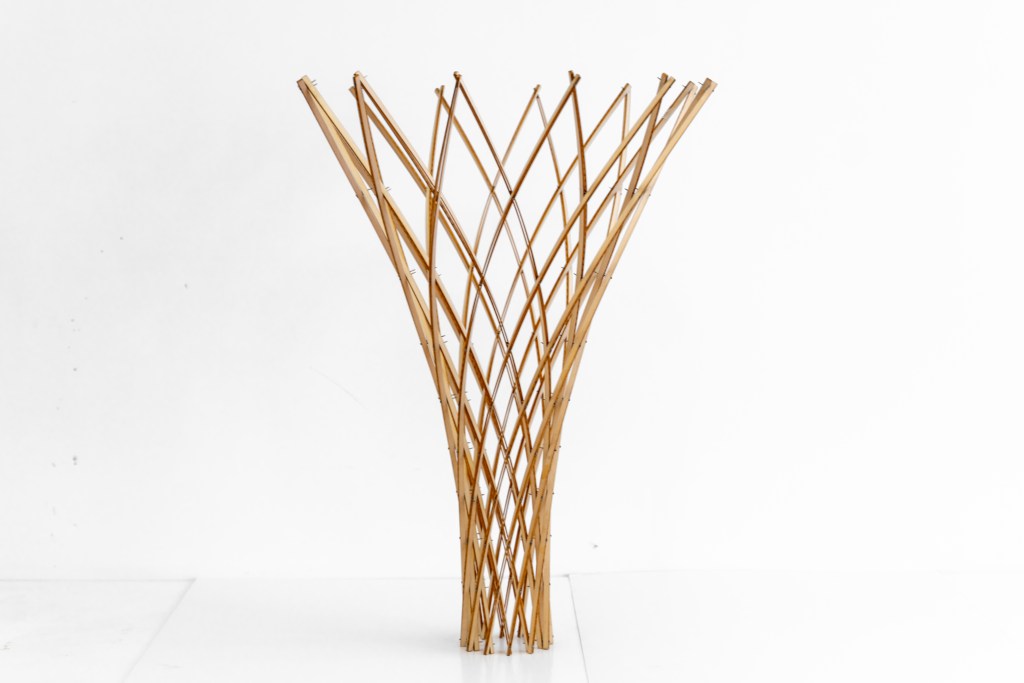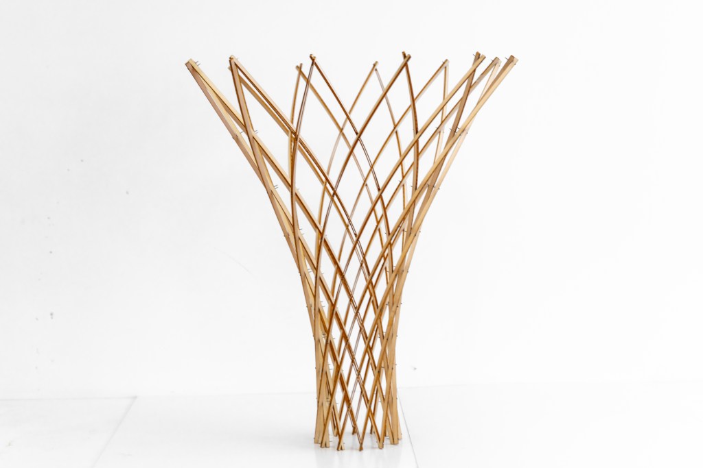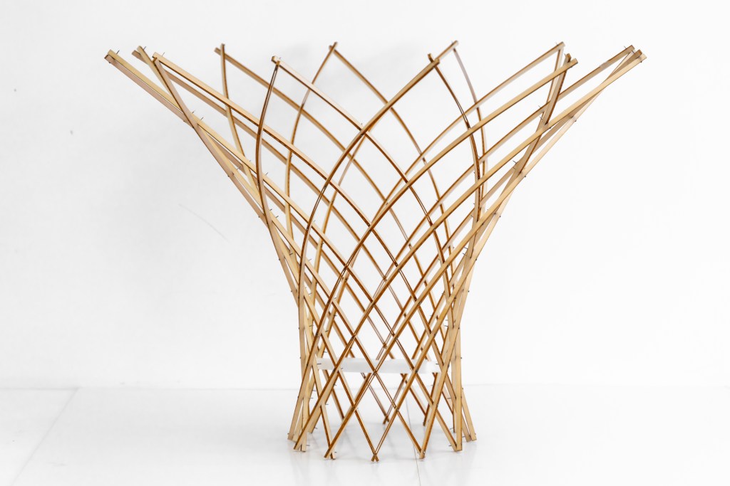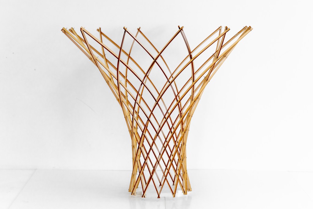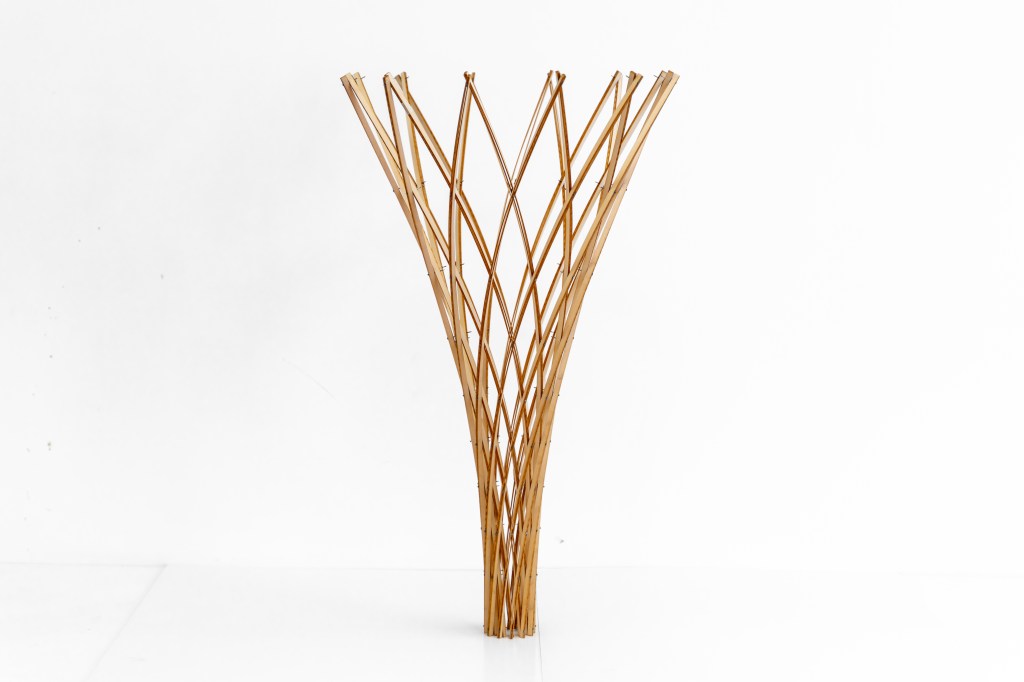 The Kinetic Umbrella is an ongoing research project to be exhibited at the AAG in Paris. It utilizes the predictable deformation behaviour of lamella-grids to create a transformable structure. The grid was designed using Finite Element Analysis, tracking the deformation behaviour under various support conditions. The lamellas will be constructed from continous, rectangular,