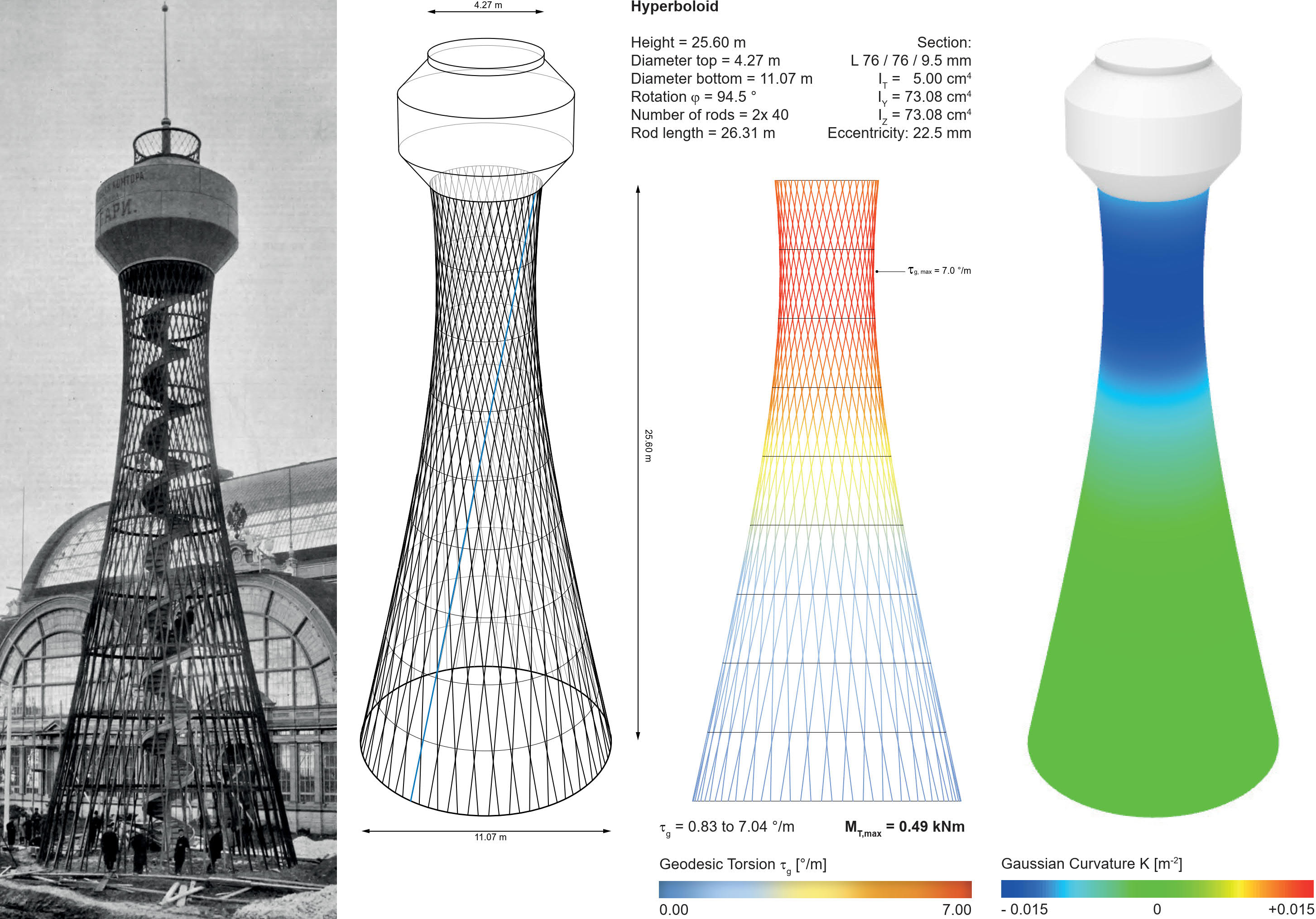 At the turn of the twentieth century, the Russian engineer Vladimir Šuchov developed an internationally acclaimed design language for steel construction. His filigree constructions – from lattice shell to the hanging roof – are timeless in their economy, lightness and, not least, simplicity. By combining a profound geometric and mechanical knowledge, Šuchov succeeded in deducing astonishingly pragmatic designs. A decisive strategy for simplification was the deliberate, elastic and plastic deformation of Z, L and flat steel profiles into continuously curved structural elements. As a result, Šuchov was able to assemble complex doubly curved grids using only repetitive components and simple riveted connections.