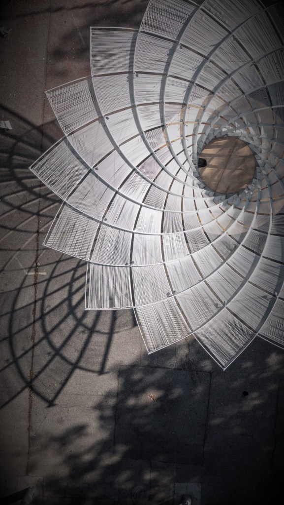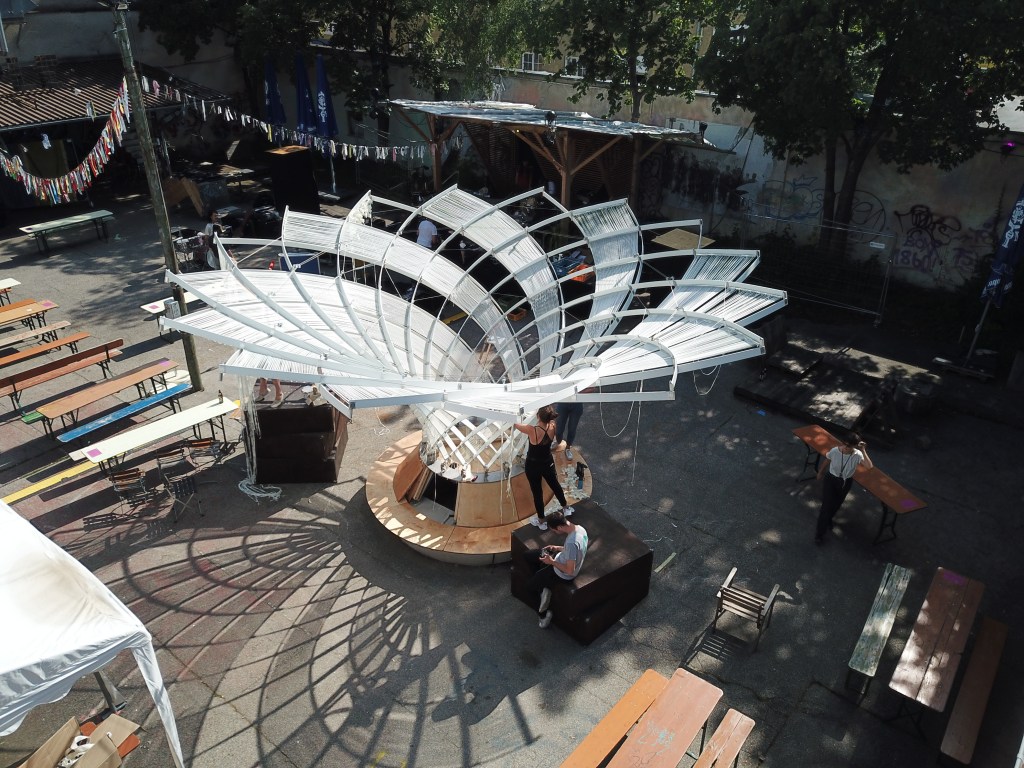 The Kinetic Umbrella consists of 32 slender FRP (Fibre Reinforced Plastic) lamellas (8x80mm), which are connected through aluminium scissor joints. The tall FRP profiles create high resistance to external loads through their strong axis, and – at the same time – may elastically bend and twist around their week axis. This allows a directed change of shape from a 6m high cylinder into a cantilevered funnel with an 8m span. The transformation is controlled using ring ropes and winches. The diagonal grid is covered with parallel textiles, that follow the changing geometry and offer sun protection.