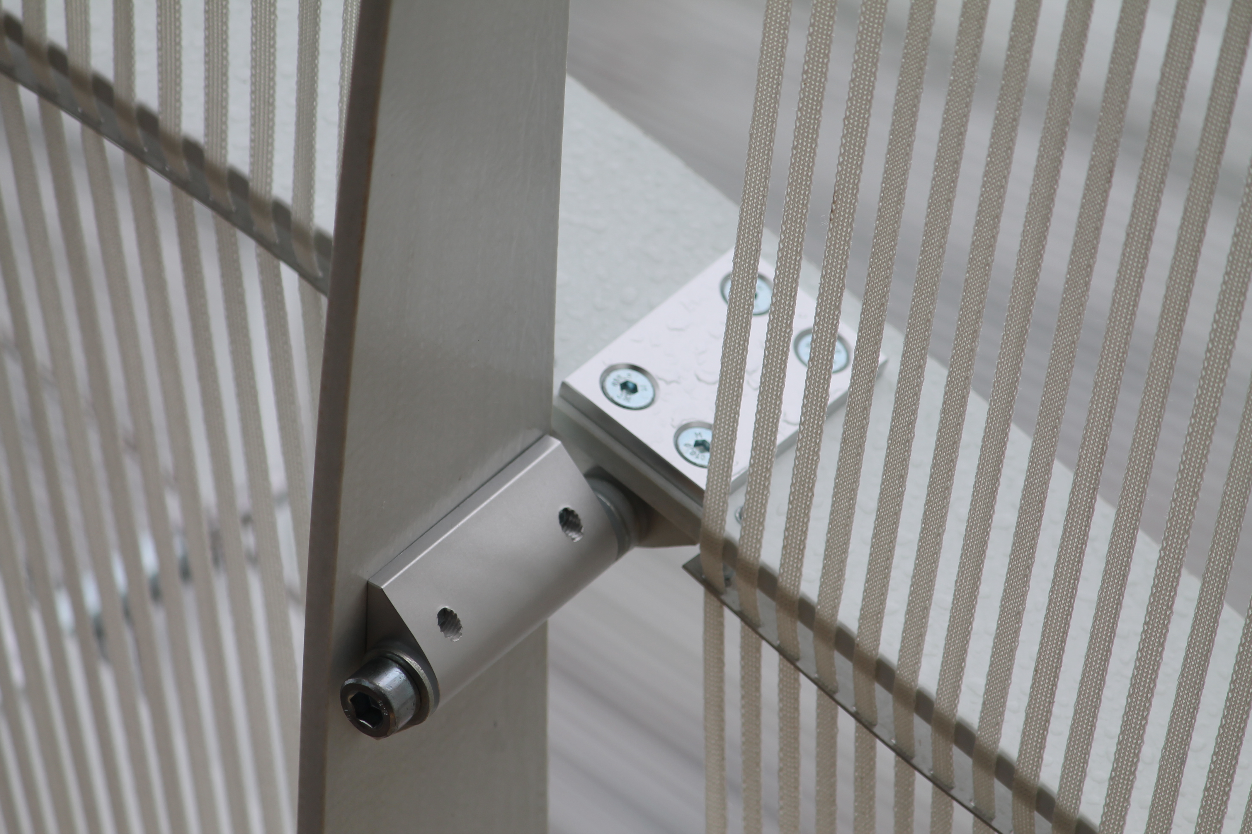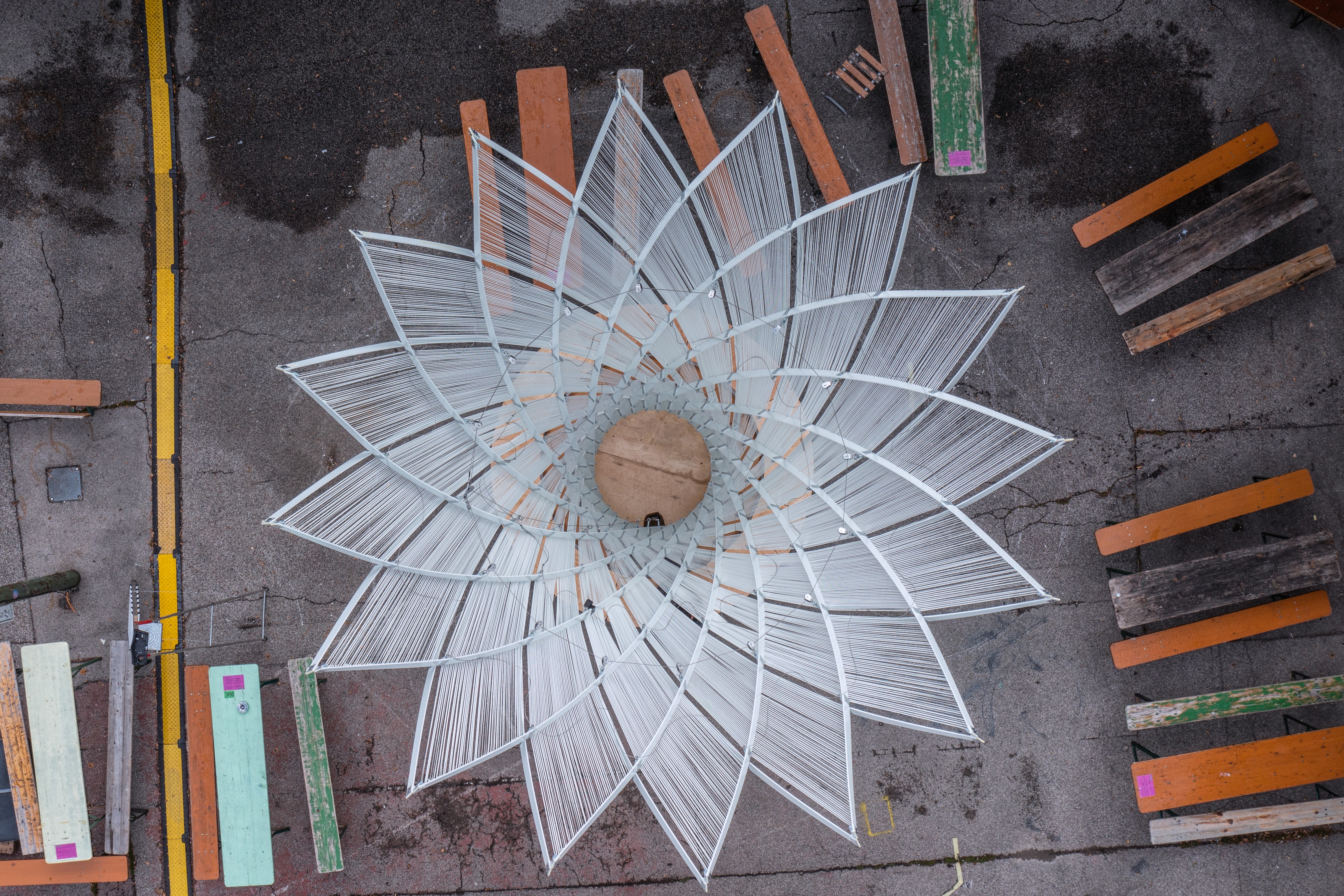 Construction. The lamellas are joined diagonally in two layers. They are connected by aluminium joints with plain bearings, to enable a smooth mechanism. The grid is mounted on a ring-shaped steel structure that facilitates the outward tilt of the structure. By slowly releasing and pulling a ring cable within the structure the grid can be easily opened and closed. Three additional rings cables at the outer, mid and low perimeter secure the final unfolded shape.
