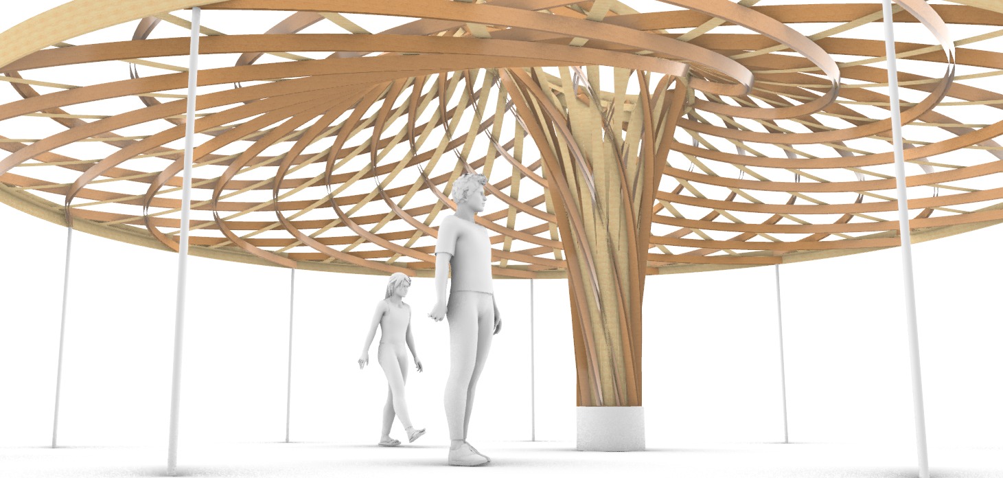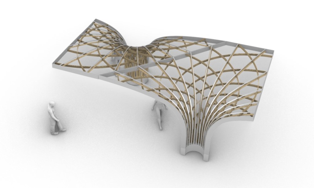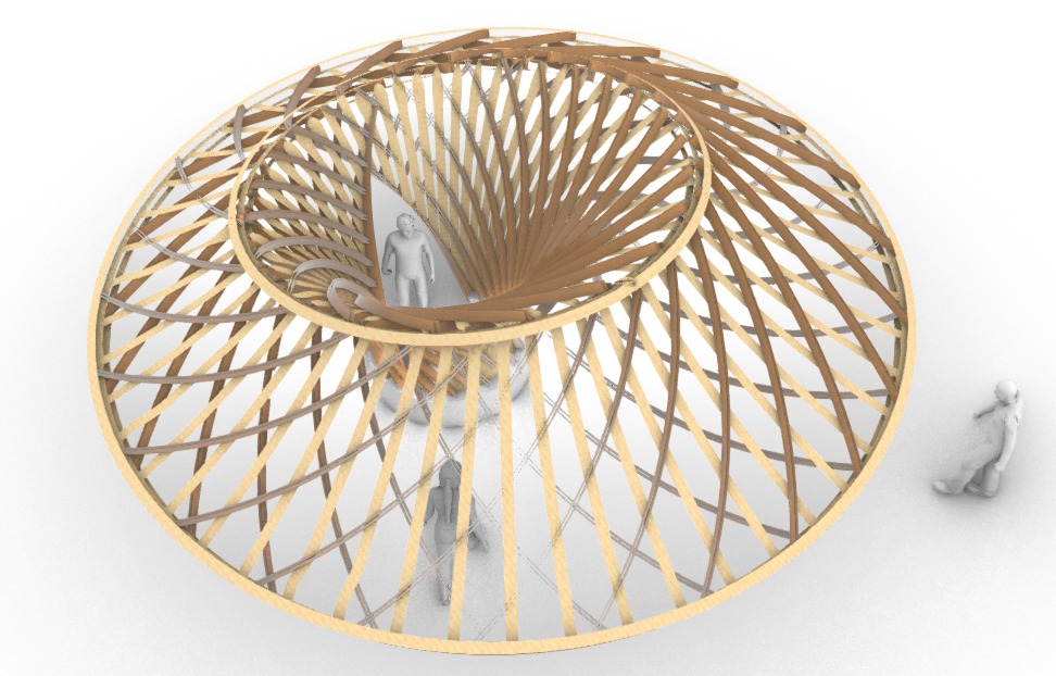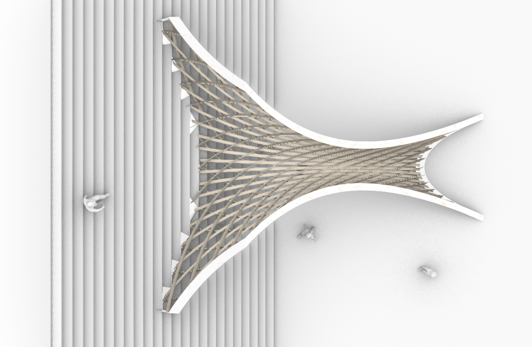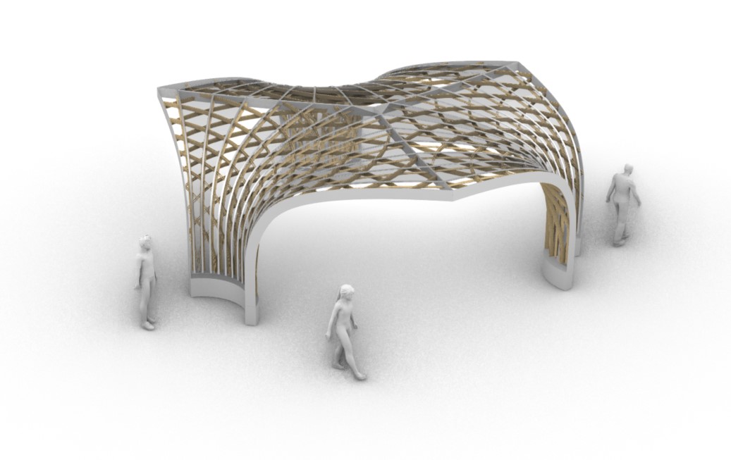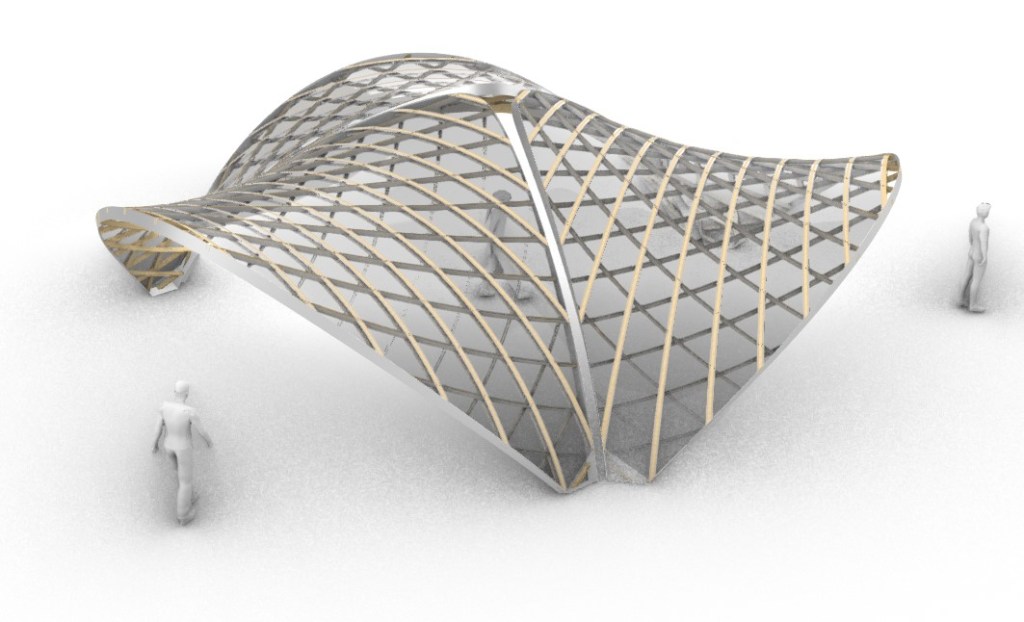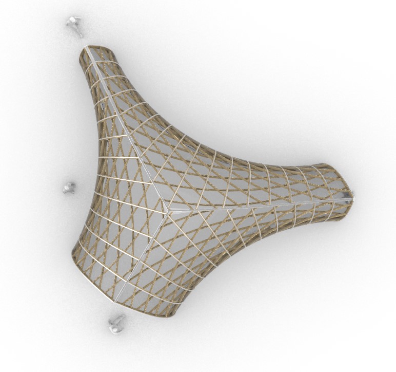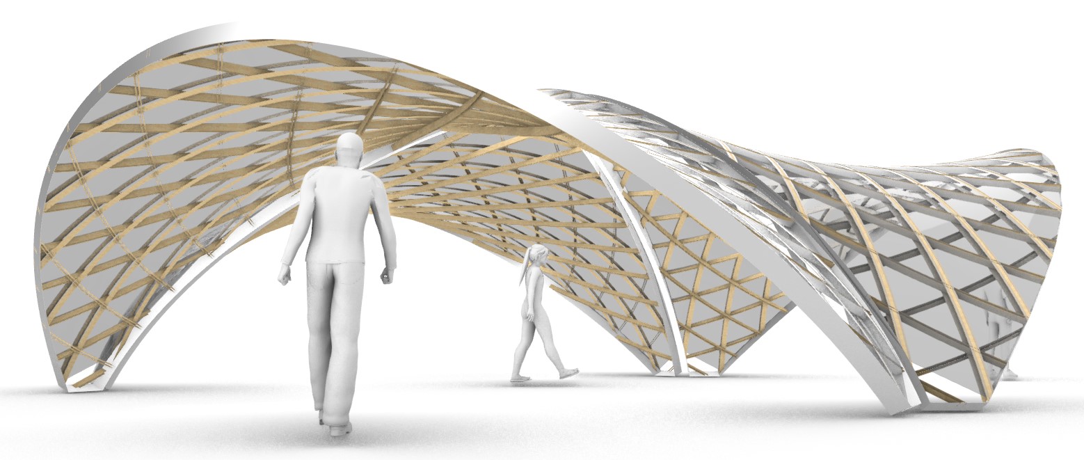 This research project combines new methods from applied geometry, computational architecture, and structural design. We design webs of asymptotic and geodesic curves to weave simple planks of wood in their tall and flat orientation into a lightweight timber structure. This offers high structural rigidity, developable panelization, simple flat prefabrication, and a kinetic erection process. A prototypical structure will be realized in fall 2022 at the Design Factory, TUM.