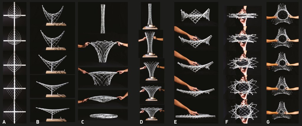 Abstract. This paper investigates the kinetic behaviour of asymptotic lamella grids with variable surface topology. The research is situated in the field of semicompliant grid mechanisms. Novel geometric and structural simulations allow to control and predict the curvature and bending of lamellas, that are positioned either flat (geodesic) or upright (asymptotic)within a curved grid.We build upon existing